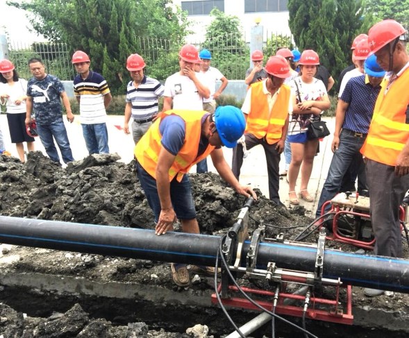 2018年9月6日上午,江都區武堅鎮開發區DN200PE管道施工現場打破了往日的沉悶,一輛輛工程施工車輛整齊地停放在道路一側,揚州市惠民區域供水投資有限公司各鄉鎮供水所和測漏維修隊將在這里進行PE管熔焊技術實踐演練活動。