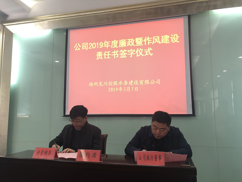 為切實加強和維護好公司一年一度的安全和諧與穩定,層層落實好公司的各項廉政暨作風建設責任,深入推進公司黨風廉政建設、反腐敗和安全工作,3月7日下午,揚州龍川水務公司舉行了2019年度安全生產目標管理責任書和廉政暨作風建設責任書簽訂儀式。公司黨政領導班子全體成員及各分公司和各部門所有負責同志都參加了會議。