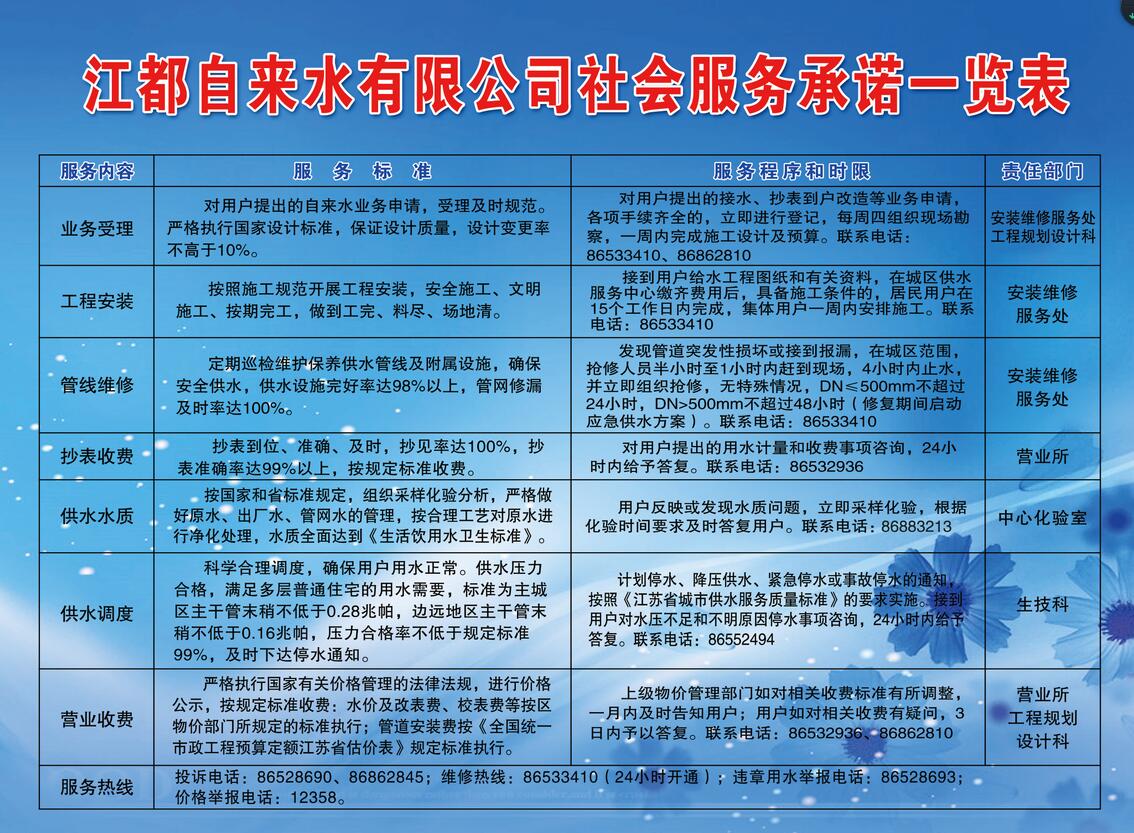 江都自來水有限公司社會(huì)服務(wù)承諾一覽表