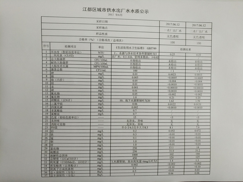 2017年6月江都區城市供水出廠水水質公示
