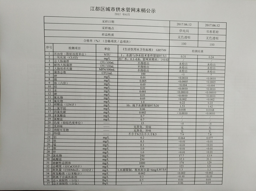 2017年6月江都區(qū)城市供水管網(wǎng)末梢公示