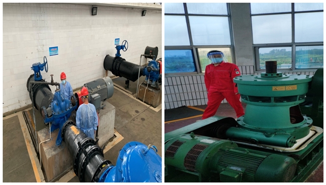 圖四:二水廠崗位防疫消毒 圖五:三水廠檢查計量泵運行態(tài)