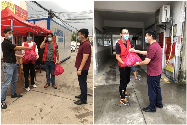 本次水務公司對口支援防疫志愿服務社區的是仙女鎮樊莊社區,王智勇帶領公司黨政工領導代表先后來到該社區無物管小區的公交公司宿舍、女神公寓、綜合樓、龍都花園、東方苑、建材廠和虹都苑等防疫執勤點,為堅守防疫一線的工作人員送上泡面、牛奶、蘇打水和口罩等生活、防疫物資,并向他們致以誠摯的問候,感謝他們在疫情防控緊要關頭,迎難而上、積極應對,始終做好“守門員”盯緊“防疫線”,用實際行動踐行初心使命,用堅毅的品格將“我為群眾辦實事”貫徹到底,并落在當前最為關鍵的抗疫實處。每到一處,王智勇都會詳細了解執勤點的干部職工的個人防護、崗點值守、后勤保障等情況,鼓勵大家繼續發揚好連續作戰的精神,細致工作,科學防控,在履職盡責的同時做好自身防護,確保用更為良好的精神狀態繼續幫助樊莊社區做好常態化疫情防控工作,與全區人民一道堅決打贏打好這場疫情防控戰。